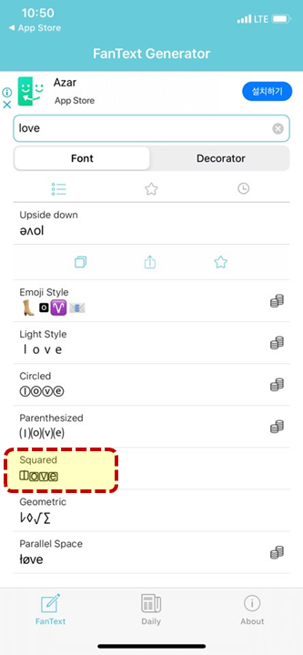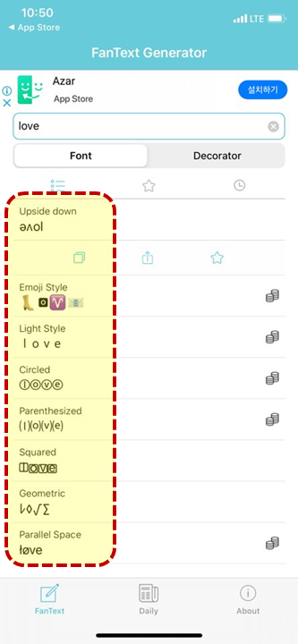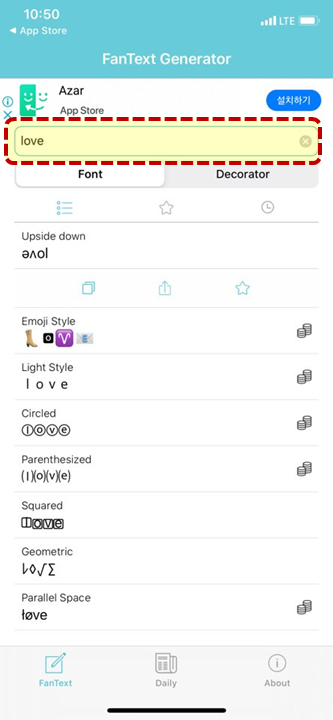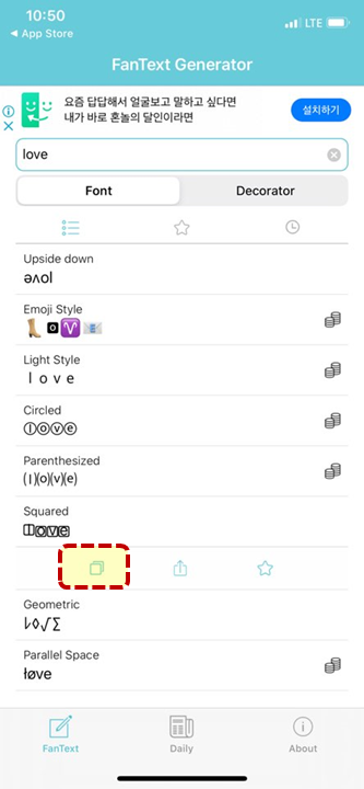 이렇게 love라는 단어를 입력해주면 글씨체 변경을 원하는 폰트 목록이 나오는데요.