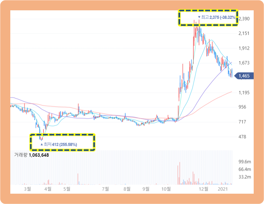 이후 보합세로 제자리걸음을 하다가, 주가는 2020년 10월에 치솟기 시작했고 최저점보다 약 5배 높은 2,375원까지 올랐습니다.