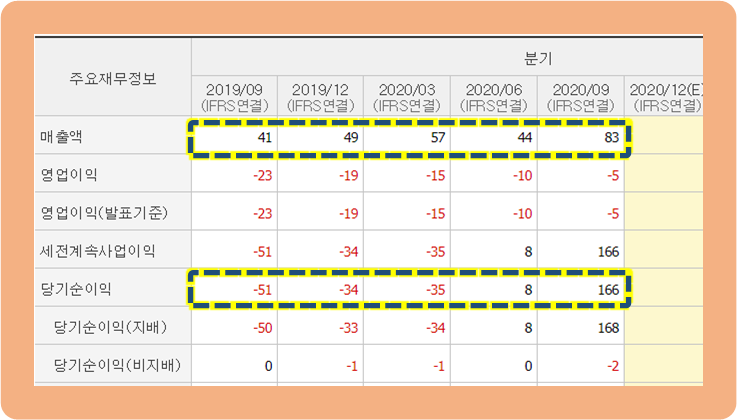 그리고 2020년 3분기의 당기순이익은 무려 166억 원으로 직전 분기의 8억 원보다 20배 이상 증가했습니다.