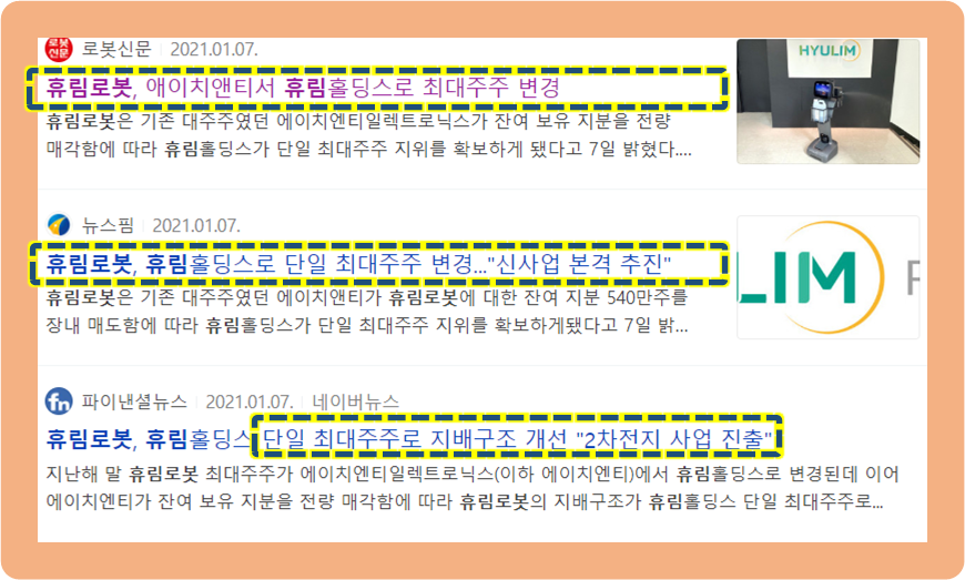 그리고 최근, 휴림로봇의 기존 최대주주로 있던 에이치엔티일렉트로닉스가 모든 지분을 매각하게 되면서 휴림홀딩스가 새로운 최대 주주로 등극했습니다.
