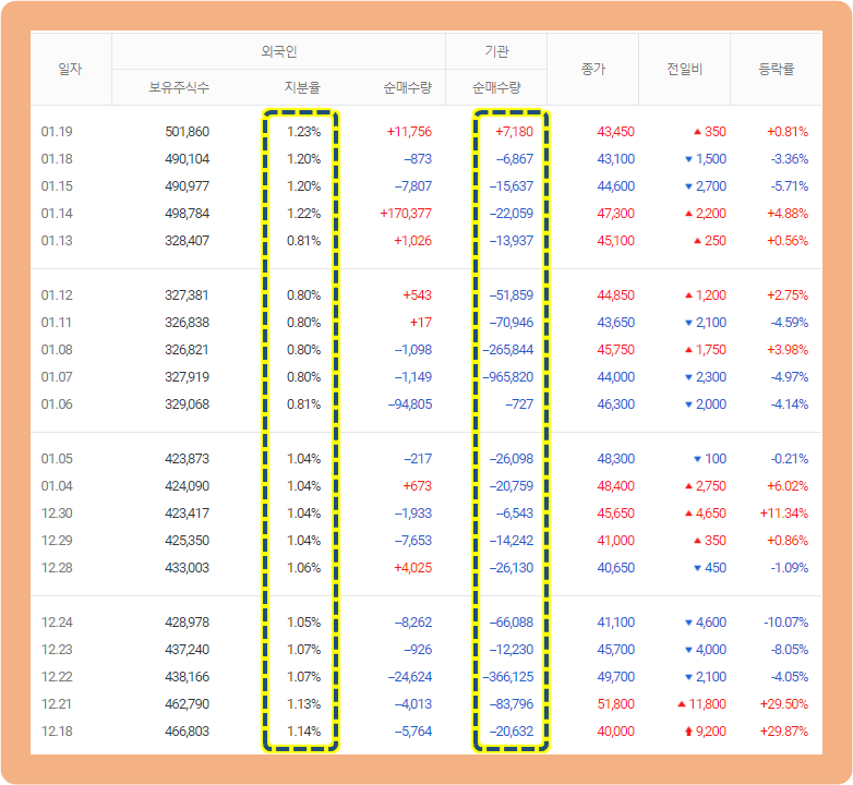 외국인과 기관의 거래 추이를 살펴보면, 외국인의 보유율은 1% 수준에 머물고 있습니다.
