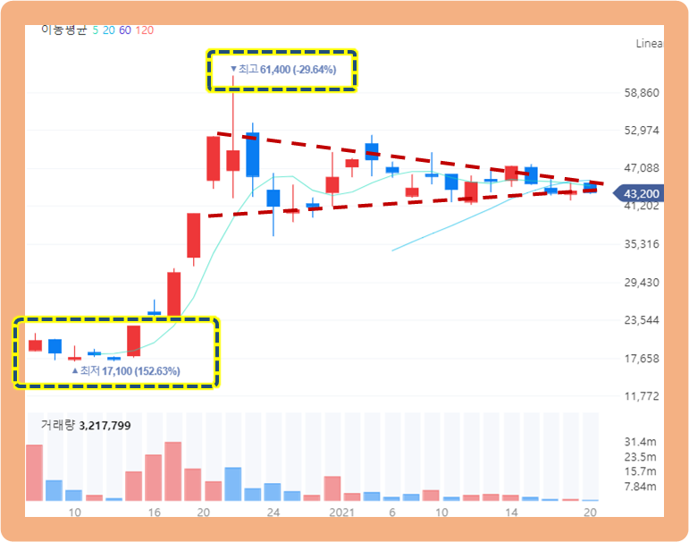 그리고 현재 주가 그래프는 삼각 수렴에 가까워지고 있는데, 머지 않아 위로든 아래로든 주가가 매우 큰 폭으로 움직일 것 같네요.