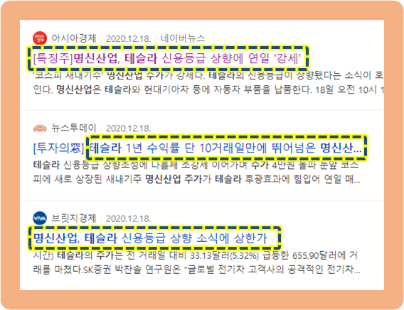 또한 작년 12월 18일, 테슬라의 신용등급이 상향 조정되었다는 발표로 명신산업가 상한가를 갔습니다.