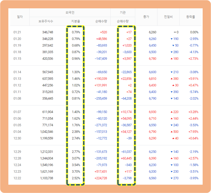 기관의 거래량은 많지는 않은 편이며, 매수와 매도가 적절히 균형을 이루고 있네요.