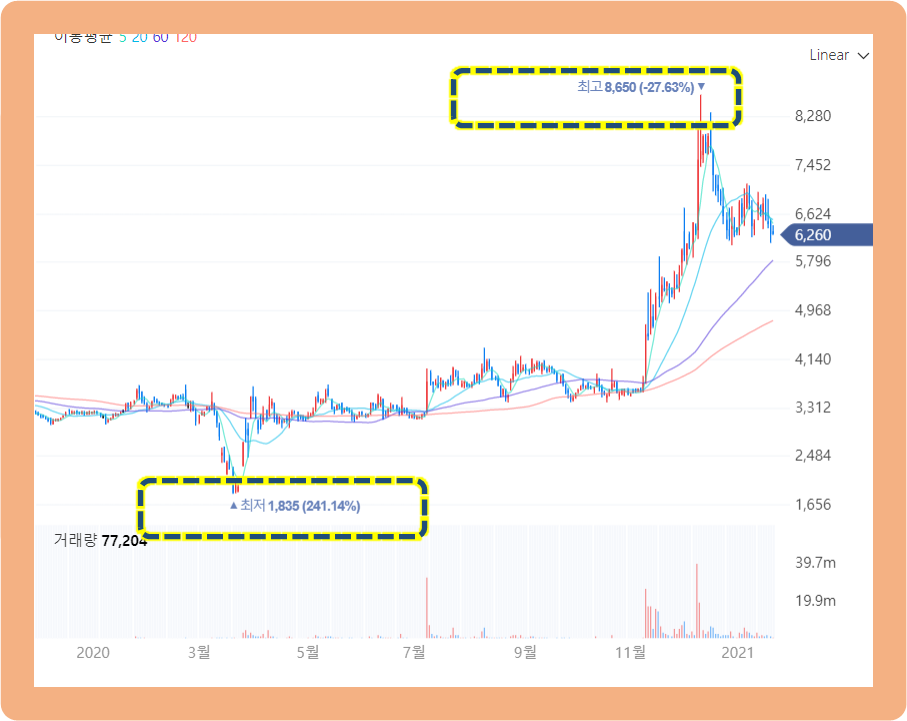 이후 20년 11월부터 가격이 급등하더니, 12월에는 8,650원까지 터치했습니다.