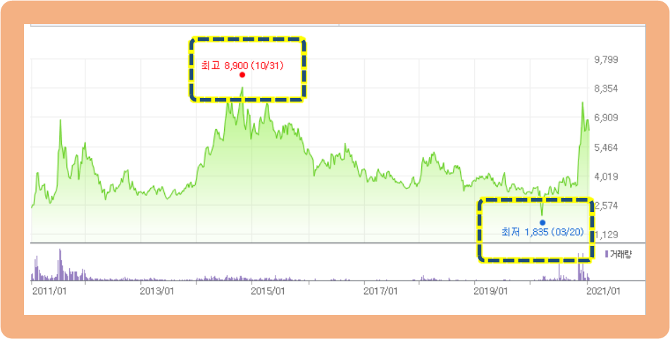지난 10년간 주가 추이를 2014년 10월 31일에 8,900원으로 최고가였습니다.
