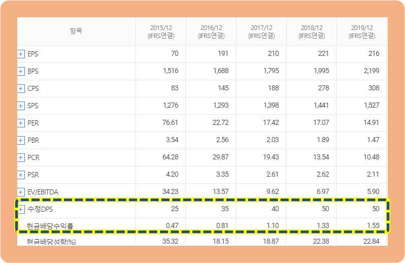 2015년에는 배담금이 25원이었는데, 배당금이 계속해서 증가하고 있습니다.