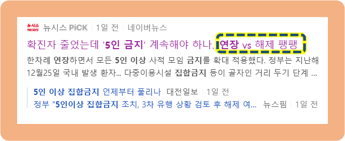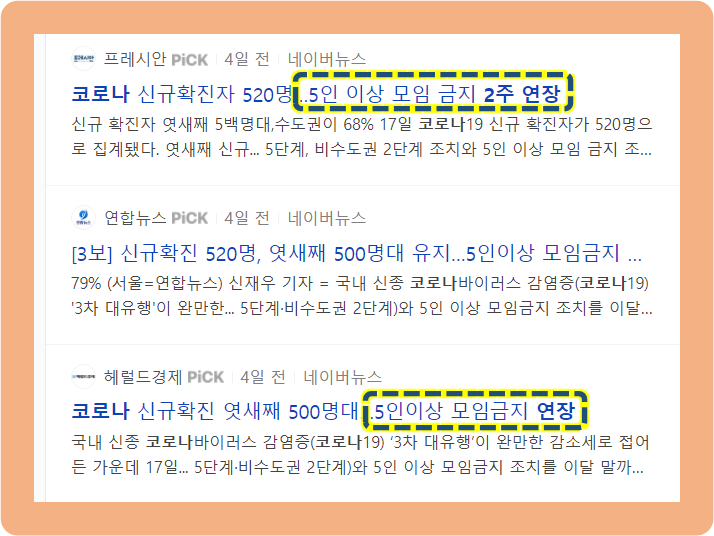 그리고 최근 5인 이상 집합 금지 등의 규제가 2주 연장되었습니다.
