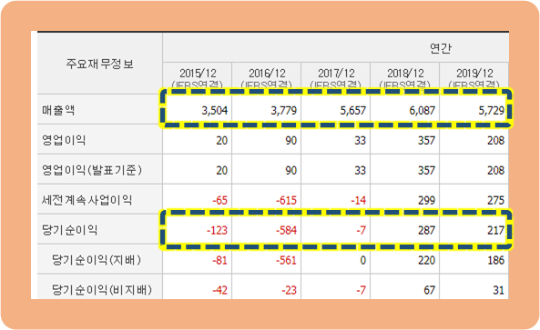당기순이익도 2015~2017년까지 3년 연속 적자였지만, 2018년부터 287억원의 이익을 내며 흑자 전환에 성공한 모습이구요.