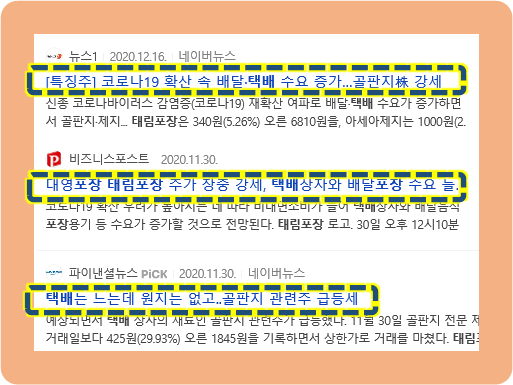 사회 전반적으로 비대면 활동이 증가하고 있기 때문에 택배, 배송 및 포장 관련 주식이 오르는 것은 당연한 것으로 보이는데요.