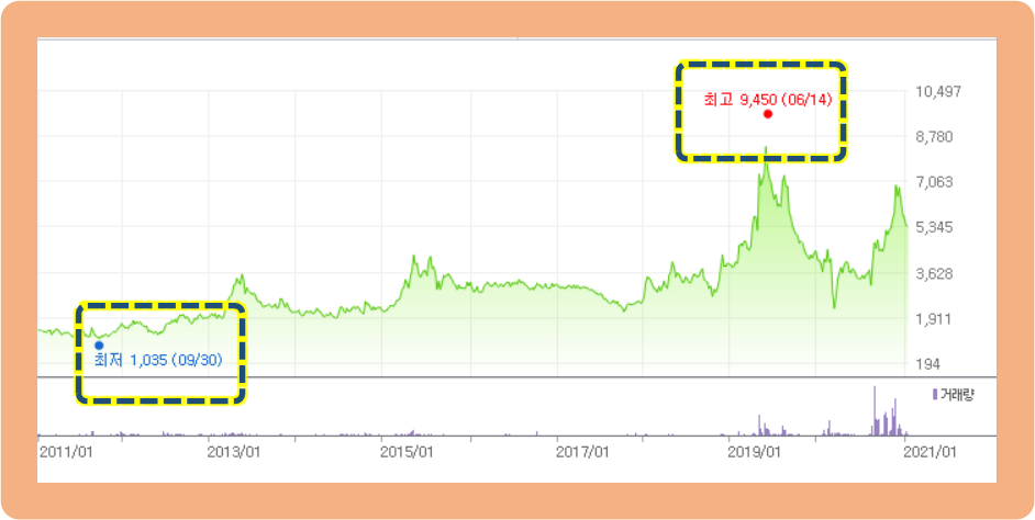 지난 10년 동안의 차트를 보시면, 과거에는 주식 가격이 약1,000원 정도였어요.