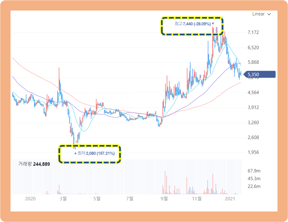 코로나 주식 시장 하락 사태 때문에 20년 3월 23일 최저 2,080원을 기록했었고, 다시 주가 반등 후 8월까지는 큰 변동이 없었습니다.