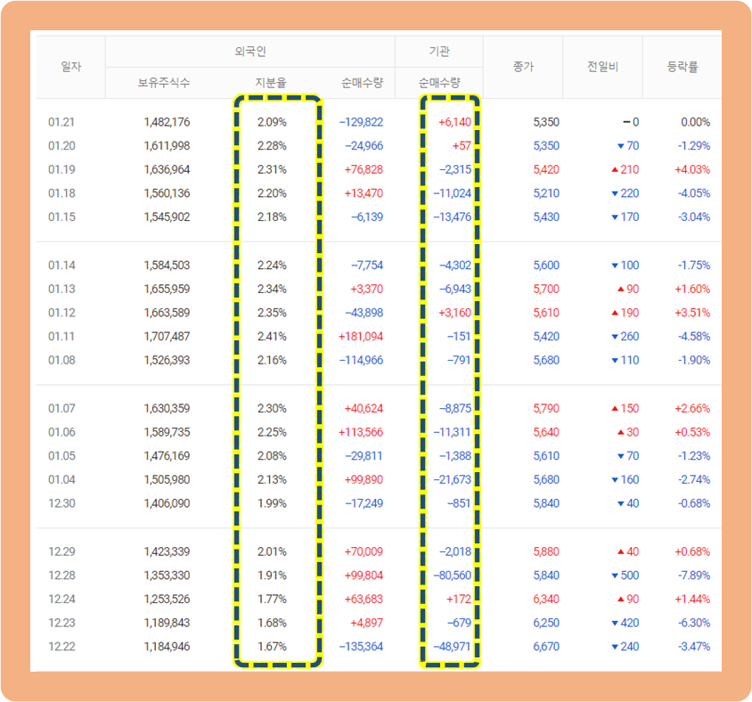 그리고 기관의 주식 거래 동향을 보시면, 매도량이 월등히 앞서고 있는 모습이네요.최근들어 외인은 매수하고, 반대로 기관은 매도하고 있는 추세입니다.