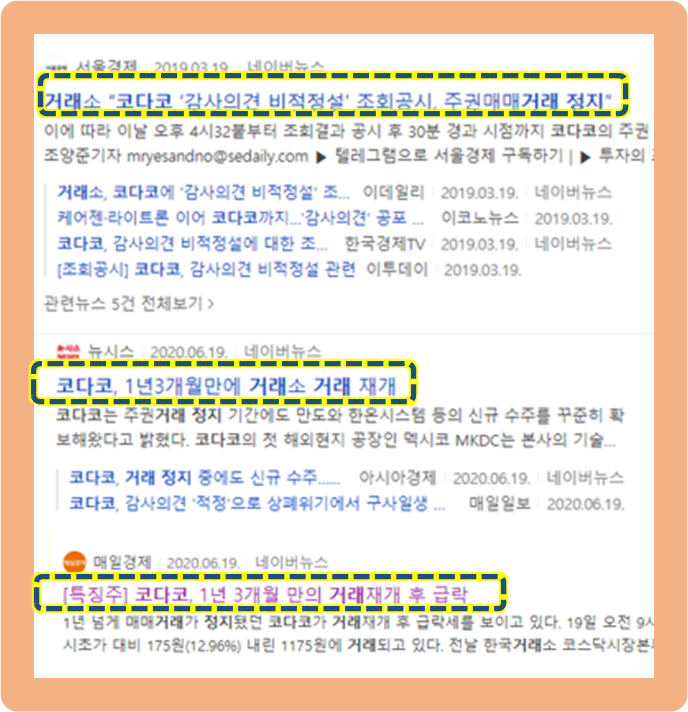 재작년인 2019년 3월경, 코다코는 부적절한 감사 의견으로 주식 거래정지를 당했습니다.