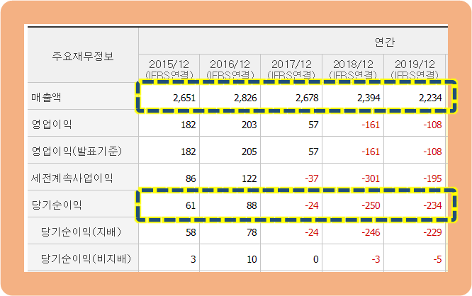 그리고 동시에 2017년 이후 당기순이익도 적자로 돌아섰고 2018년과 2019년 사이에 적자폭이 확대되고 있구요.