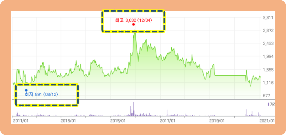 지난 10년 동안의 주가 추이를 보시면 2010년 861원에서 2015년 12월에는 3,000원까지 상승했었습니다.