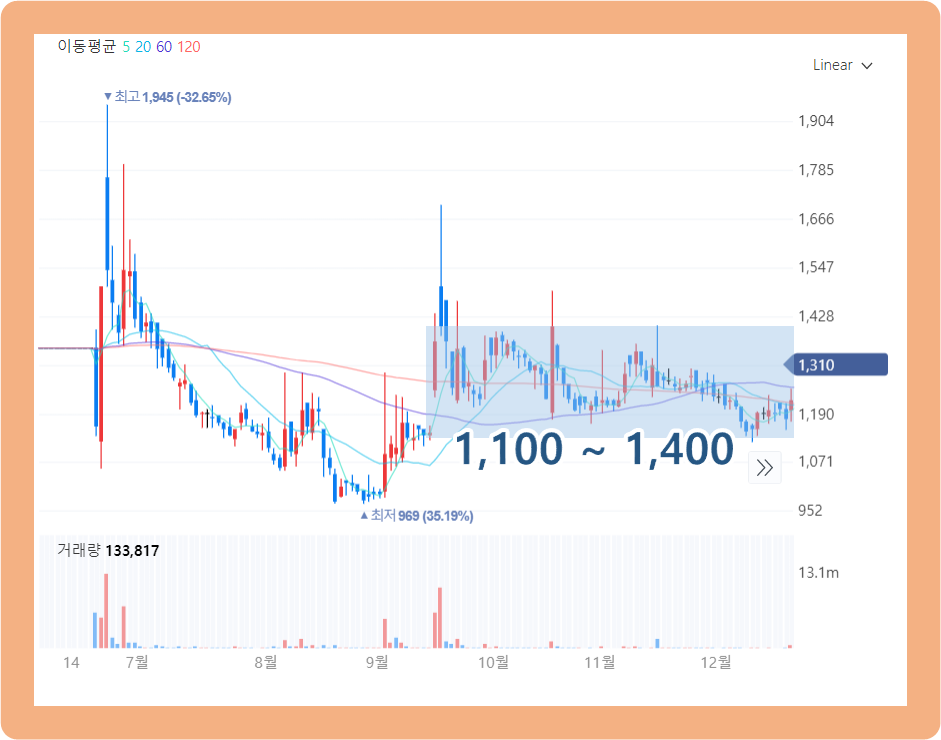 그리고 작년 20년 9월 이후부터 주가가 다시 조금 상승하더니, 최근에는 1,100원에서 1,400원 박스권 사이에서 등락을 반복하고 있습니다.