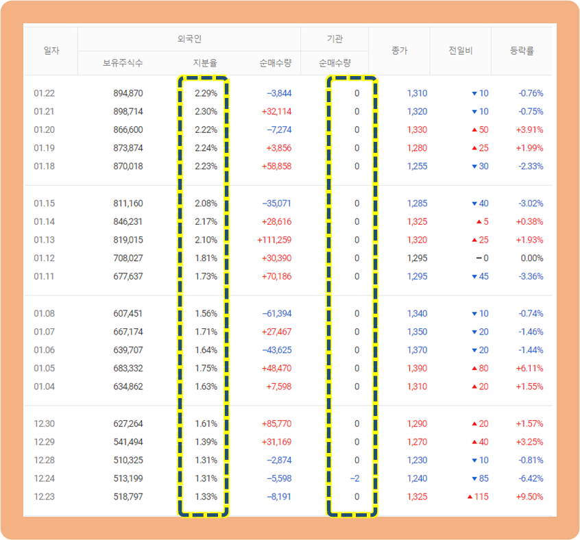 기관 매매량은 거의 없다고 봐도 무방합니다.