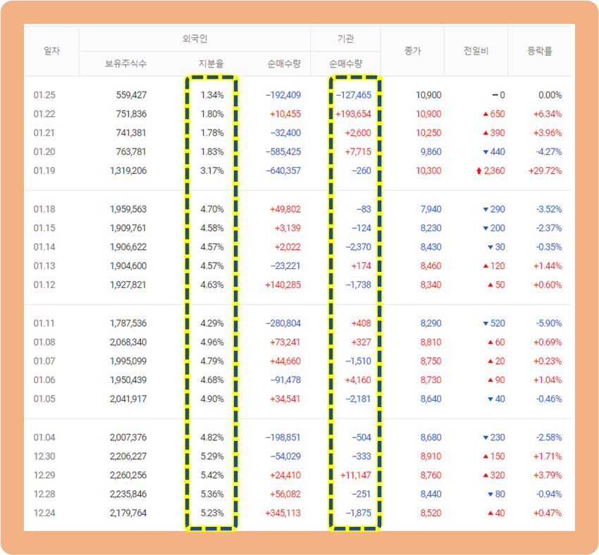 이와 반대로 기관들은 최근 매수량과 거래량을 늘리고 있는 추세입니다.