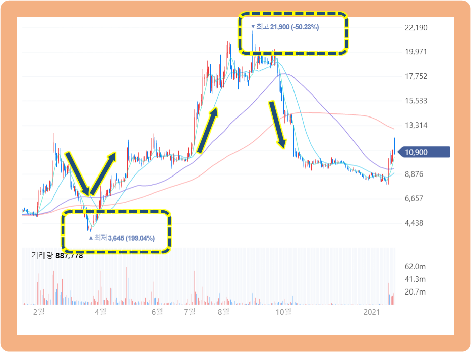주식을 보유하고 있던 대부분의 투자자분들은, 더 오를 것 같은 마음에 2만 원에 익절하지 못하셨을 겁니다. 주식은 익절도 어렵고 손절도 어렵죠 참.