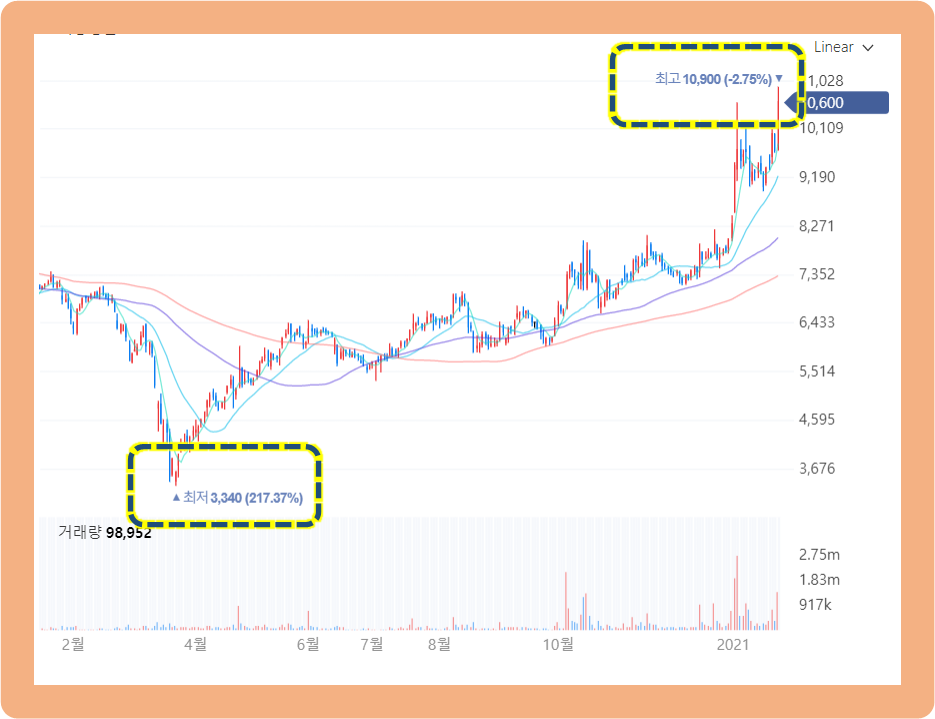 코로나로 인한 주식 시장 대하락 사태로 인해, 2020년 3월경 가격이 3,340원까지 하락했었습니다.