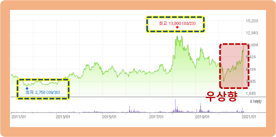 10년 전만 해도 2,750원 수준이였는데, 2018년 3월도엔 무려 13,800원까지 상승했었습니다.