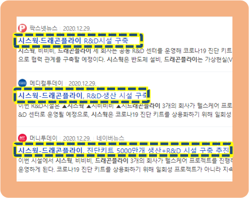 업계에서는 반도체 장비 업체인 시스웍, 의료기기 전문 생산업체인 비비비, 그리고 AI, VR 등 최신 기술을 통해 디지털 치료제를 연구하는 드래곤플라이 3개사의 협력을 통해서 좋은 시너지 효과가 나올 것을 기대하고 있습니다.