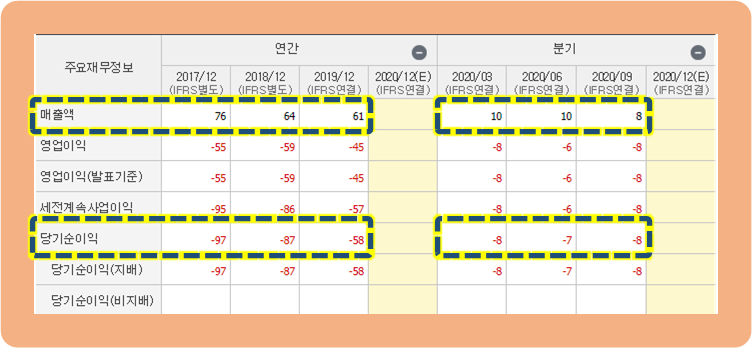 2017년부터 매출액은 매년 줄어들고 있으며, 순이익도 지속적인 적자를 기록하고 있는 상황인데요.