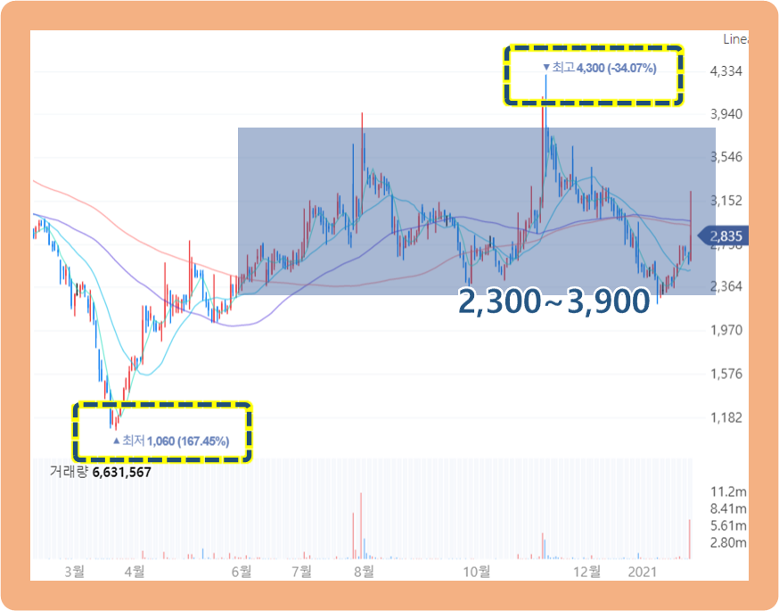 하지만 4,300원을 기록한 후 주가는 다시 2,300원에서 3,900원 사이를 오르내리고 있는 중이네요.