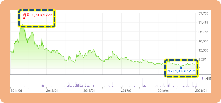 최근 10년 동안의 주가 차트를 보시면, 2011년도 10월경엔 30,000원이 넘었습니다.