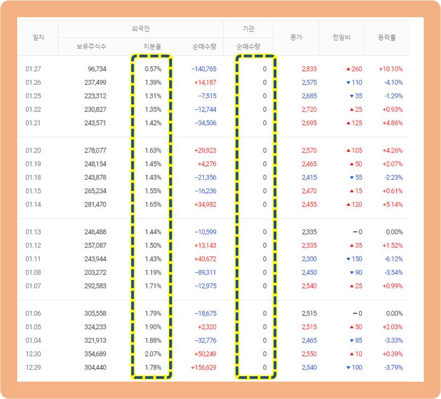 그리고 외국인들의 보유율은 한 달 동안 1%대를 유지하고 있는 모습입니다.