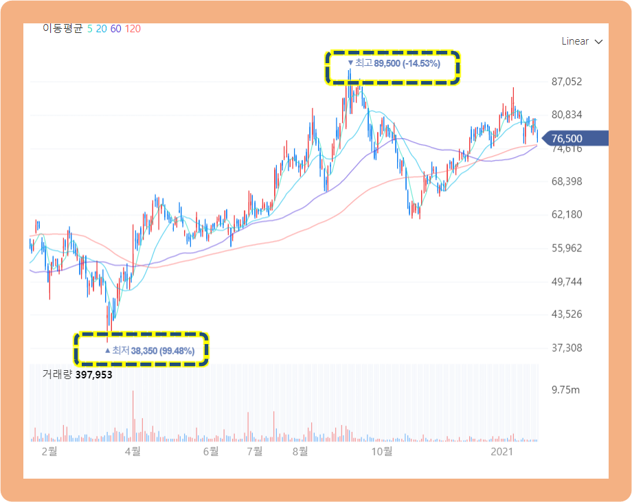 코로나 주식 시장 하락으로 인해, 2020년 3월에 최저 38,350원까지 떨어졌었는데요.