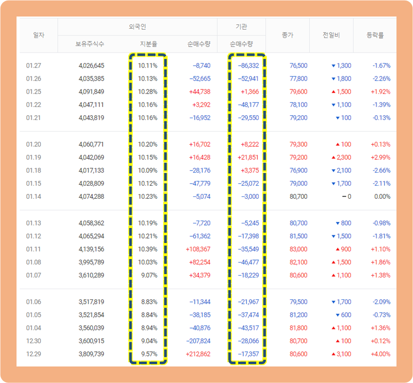 반면에 외국인투자자들은 조금씩 비중을 늘려나가고 있으며, 현재 보유율이 10%대까지 올라왔습니다.