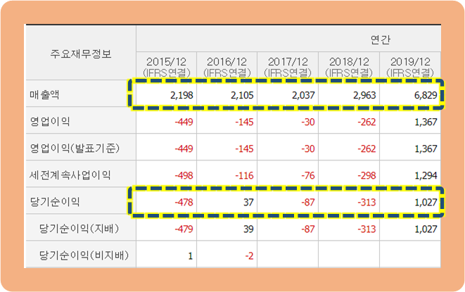 2018년도까지 2000억 원을 유지하고 있던 연간 매출액이, 2019년 기준 무려 6,000억 원을 기록하면서 2배 이상 증가했네요.