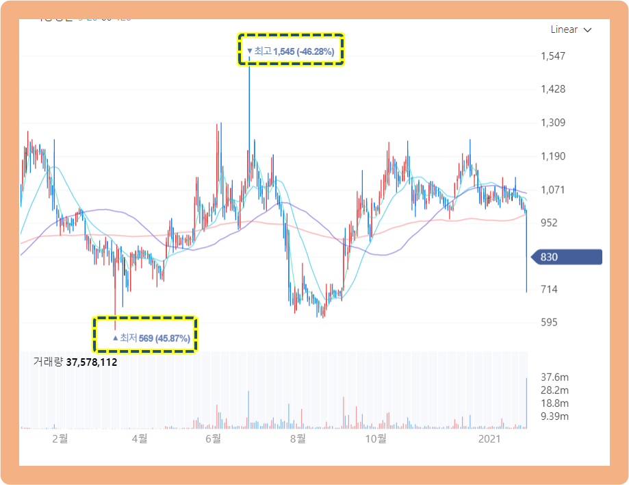 작년 2020월 3월, 코로나로 인한 주식 시장 하락 때 569원까지 하락했었습니다.