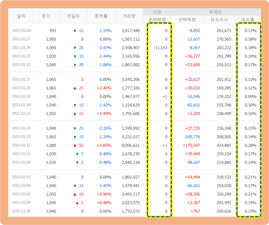 외국인 투자자들의 지분 보유율도 1%대 미만을 유지하고 있구요.