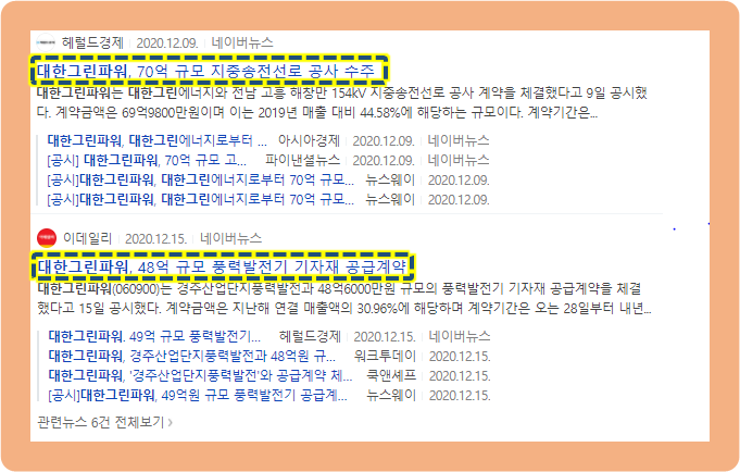그리고 2020년 12월 9일, 대한그린파워는 대한그린에너지와 전라남도 고흥 해창만 소재의 15KV 지중송전선로 공사 계약을 체결했구요.