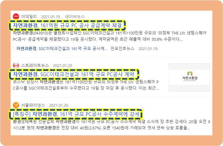 그리고 2021년 1월 20일에는, 플랜트사업체 SGC이테크건설과 약 161억원 규모의 의정부 더 리브 센텀 스퀘어 PC 공사 공급 계약을 체결하였는데요.