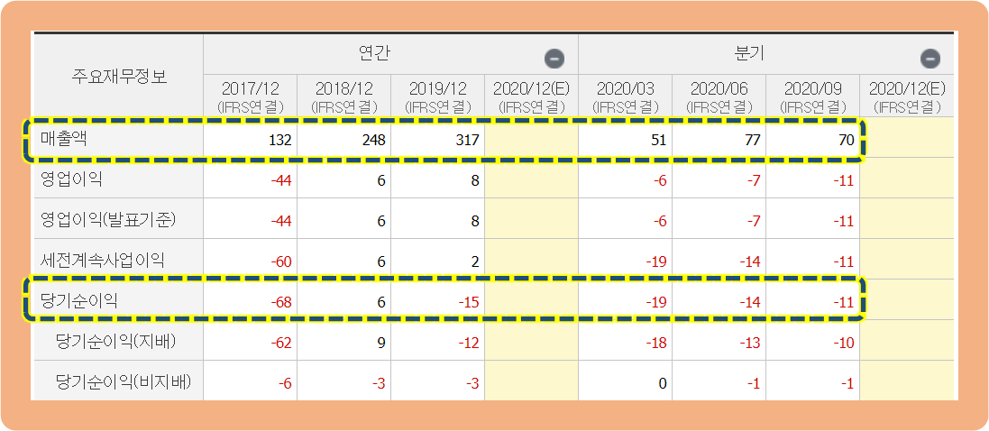 그리고 2020년 1, 2, 3분기 모두 당기순이익이 연속으로 적자를 기록하고 있는 중이네요.