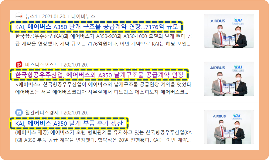 2021년 1월 20일에는 한국항공우주와 에어버스가 A350-900, A350-1000 모델의 날개 뼈대를 공급하는 계약을 연장했다는 소식이 있었습니다.