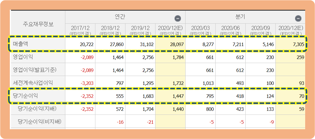 2020년 분기별 당기순이익도 흑자 추세이기 때문에, 2020년 연간 순이익도 약 1,400억 정도의 흑자를 기록할 것으로 예상됩니다.