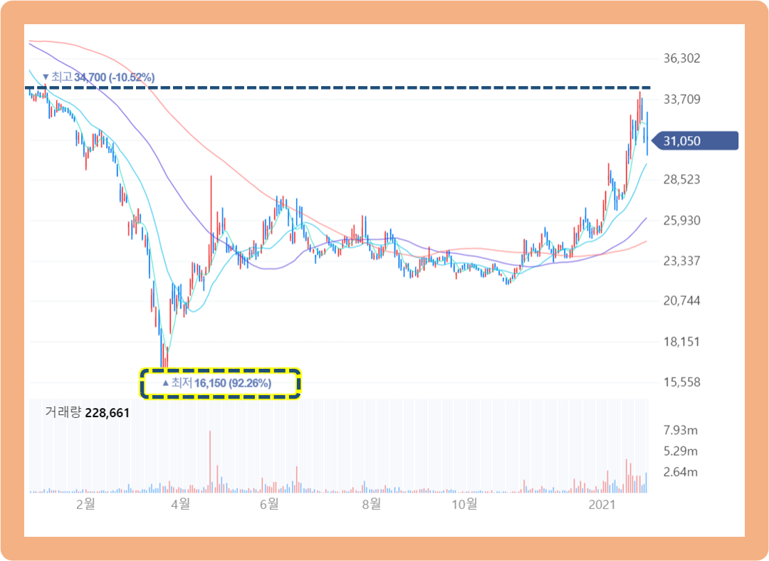 2020년 3월경, 코로나로 인한 주식 시장 침체로 인해 주가는 16,150원까지 하락했는데요.