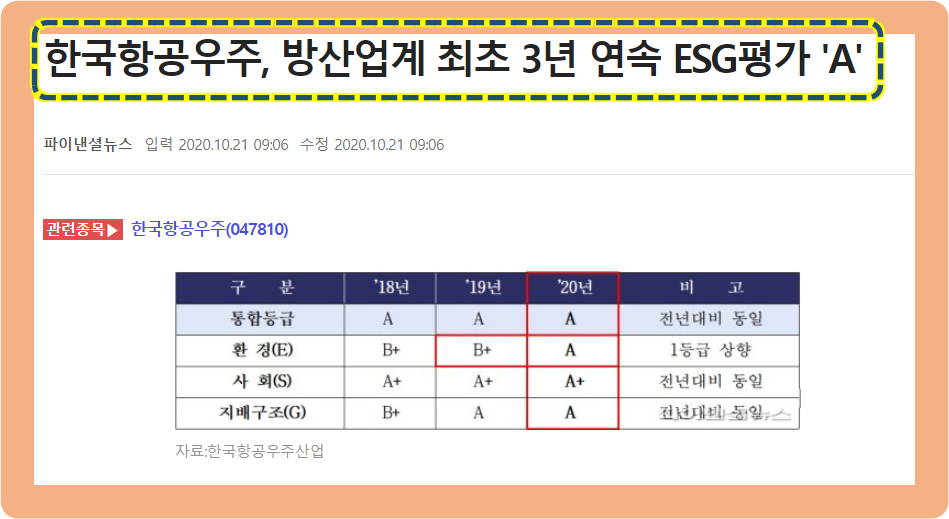 우선, 2020년 10월경 한국기업지배구조원의 ESG평가에서 한국항공우주가 국내 방산업계에서 최초 3년 연속 A등급을 획득했습니다.