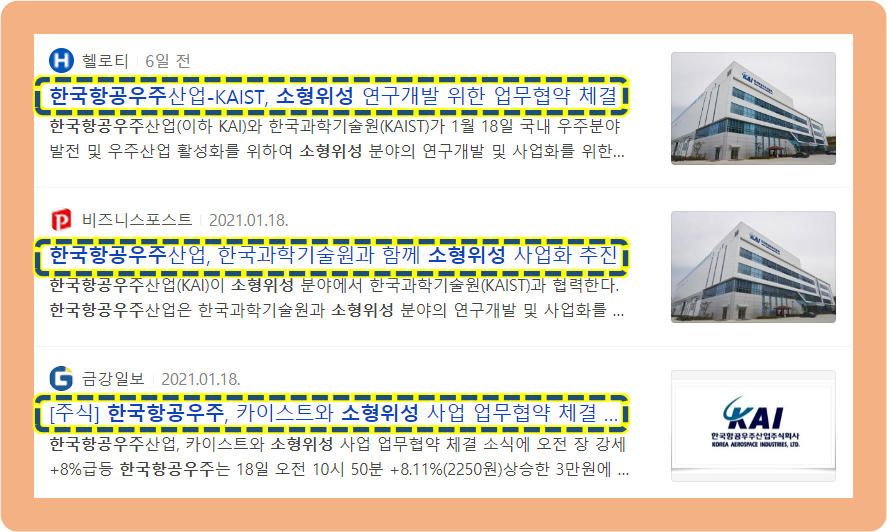 그리고 2021년 1월 18일, 한국과학기술원과 한국항공우주는 국내 우주분야의 발전 및 활성화를 위해 소형위성 분야의 연구개발 관련 MOU를 체결했습니다.
