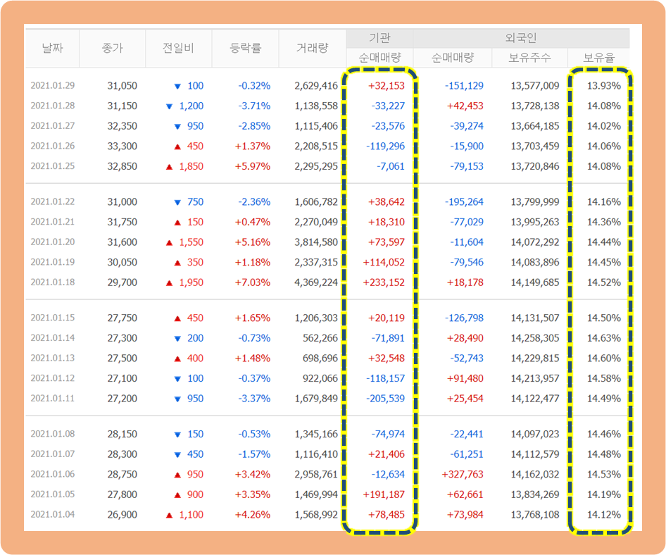 그리고 외국인의 주식 보유율은 약 14% 내외를 유지하고 있는 모습이네요.