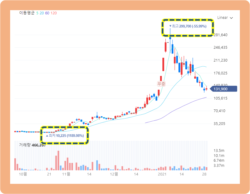 최저점 10,225원이고 최고점은 299,700원으로 무려 15배 가까이 상승한 것입니다.