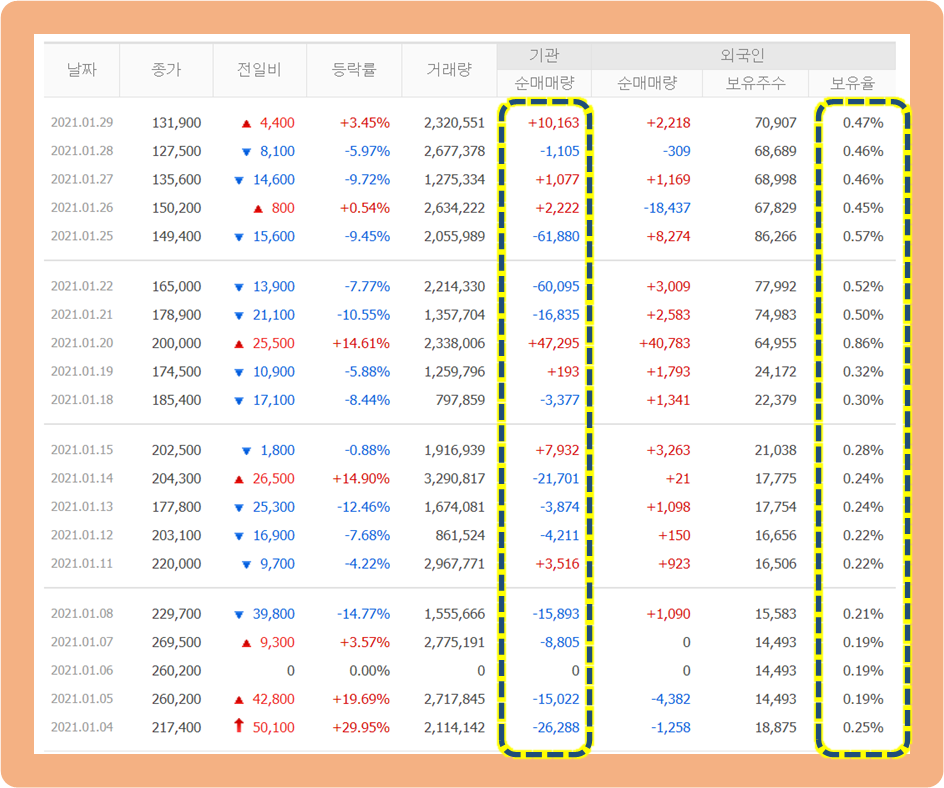 그런데도 주가 급등이 멈추지 않았기 때문에, 2021년 1월 5일에 투자위험종목으로 최초로 지정하면서 1월 6일 하루 주식 매매거래가 정지되기도 했습니다.