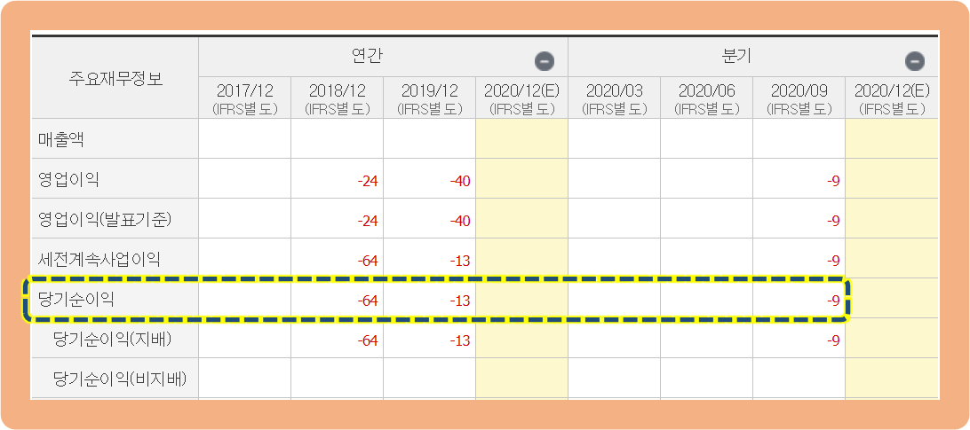 2020년 3분기 기준 당기순이익도 마이너스 9억원을 기록했습니다.