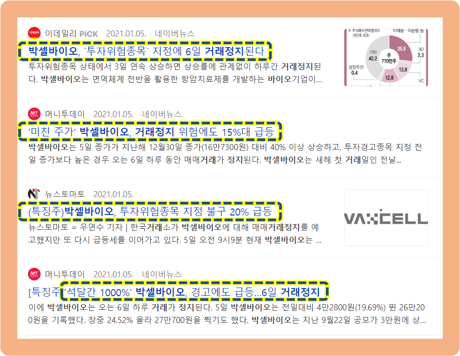 그리고 박셀바이오 주식 가격이 올라도 너무 올라서, 2020년 12월 29일 투자경고 종목으로 지정됐었는데요.