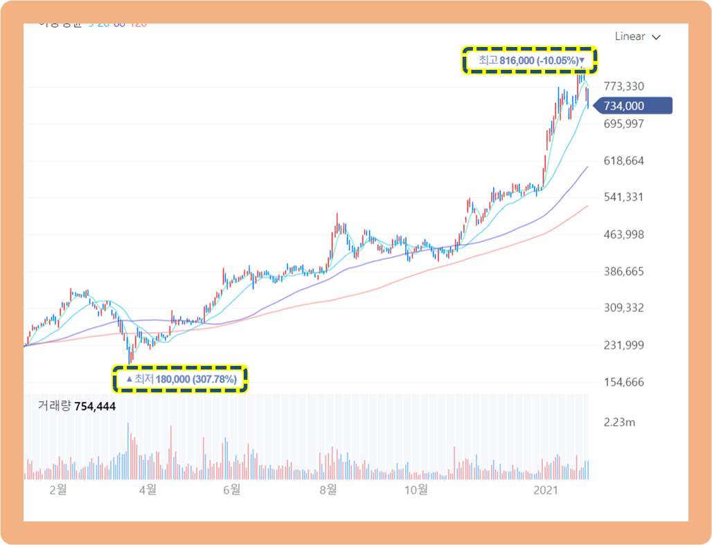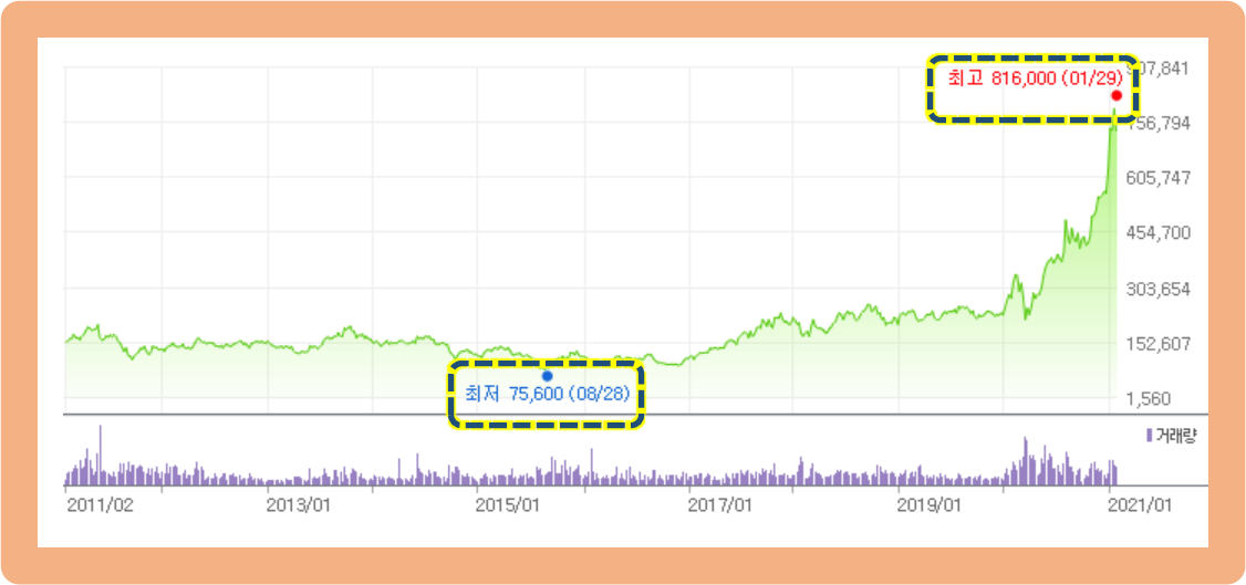 이후 주가는 제자리로 회복하는 모습을 보이더니, 현재까지 꾸준히 가격이 올라오면서 2021년 1월 26일에는 무려 816,000원을 기록했습니다.